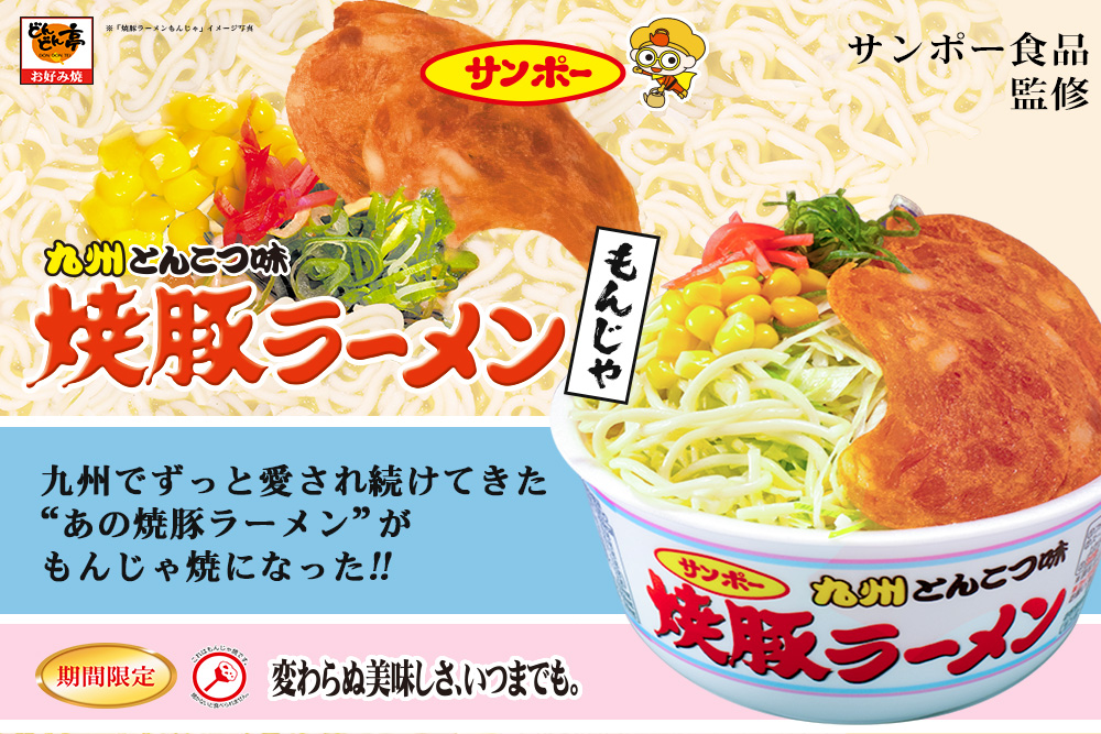 “お好み焼専門店どんどん亭”は、サンポー食品株式会社(本社:佐賀県三養基郡、代表取締役社長:大石 忠徳)の監修メニュー『焼豚ラーメンもんじゃ』を、2026年3月11日(水)よりどんどん亭全店で数量限定で販売いたします。