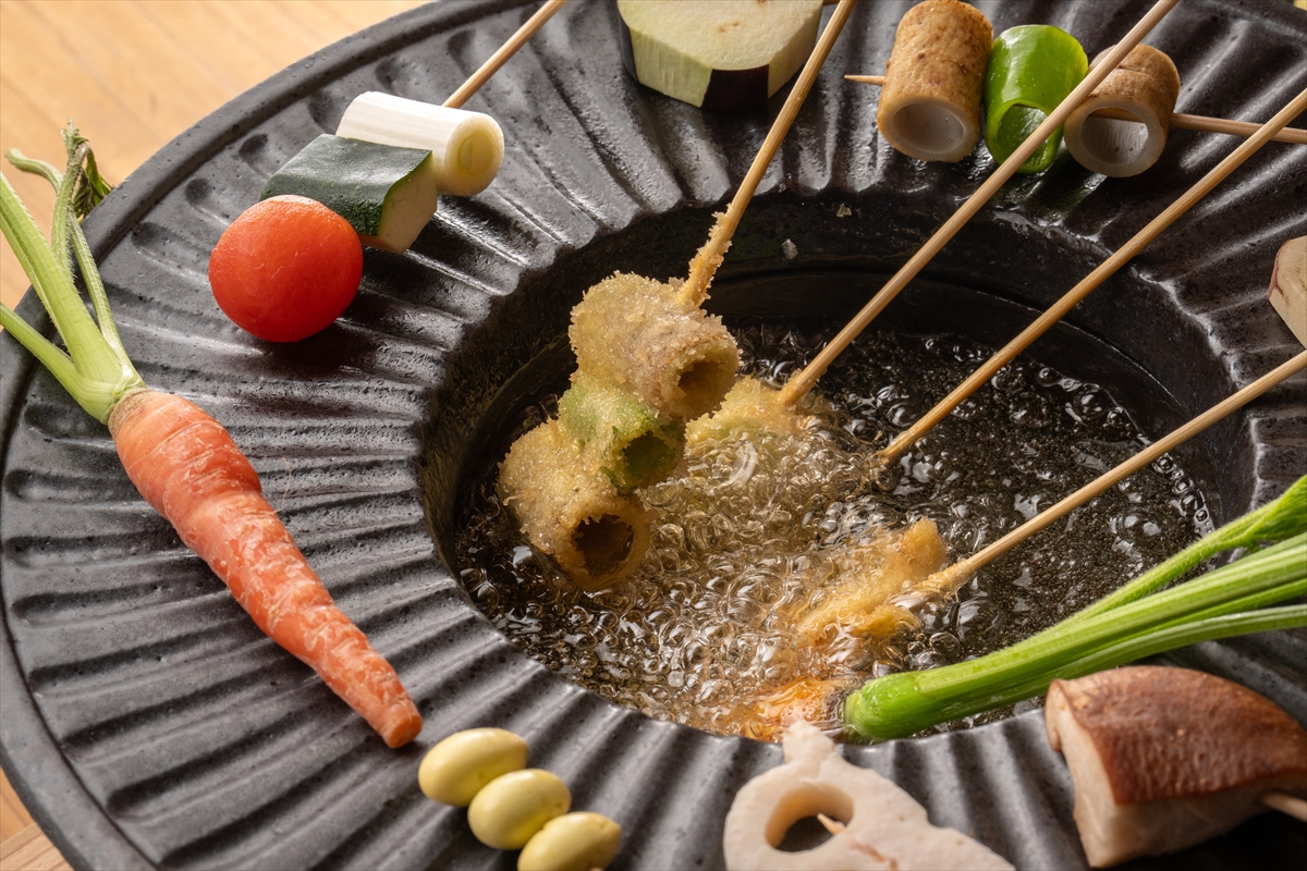 「里山の旬菜 菜種揚げ」は、厳選された地元の旬野菜を、お客様自身のタイミングで揚げていただく体験型メニューです。